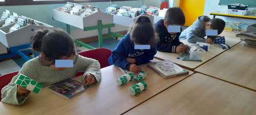 Les Cp classent les livres à l'aide de gommettes de couleurs